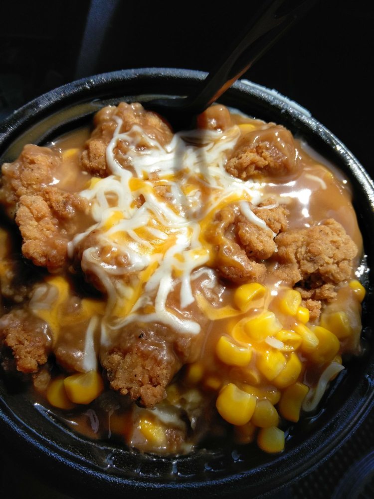 Creamy mashed potatoes, sweet corn and bite-sized chunks of crispy chicken are layered together then drizzled with home-style gravy and topped with a perfect blend of three shredded cheeses and our signature Nashville Hot sauce.